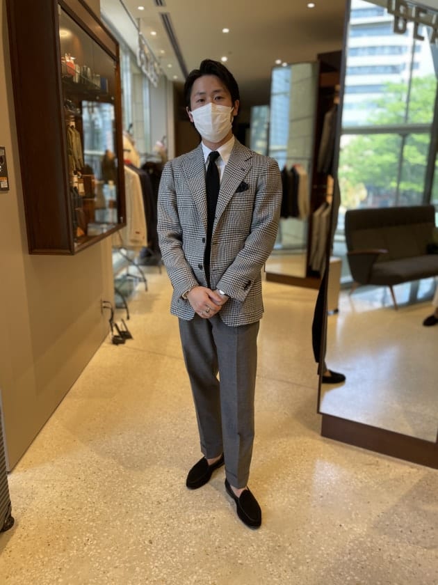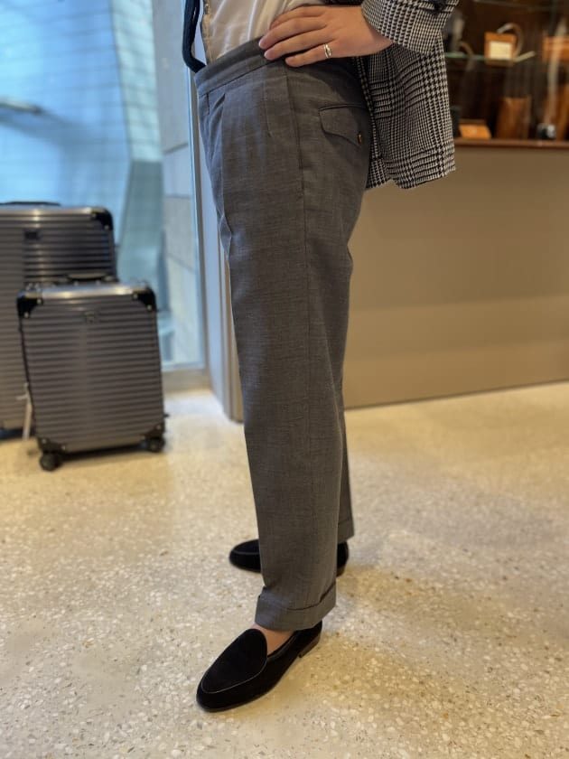 スタッフ上原はパンツにチェックを取り入れておりました!シューズは今、ドレス界の新定番になりつつある<BAUDOIN AND LANGE>のローファーをチョイス。トレンドを見逃しません。
