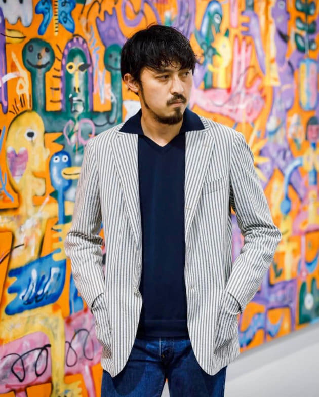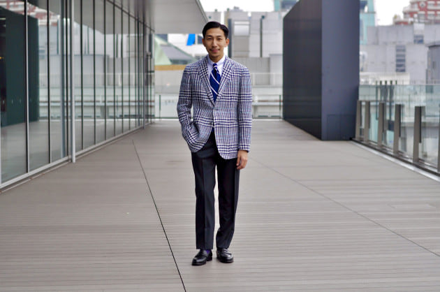 2コーディネート目。タイドアップしてみました。ネクタイに変えただけですが印象がガラッと変わります。ジャケットの主張が強いのでこれ位、間隔の広いストライプでバランスを取るといいと思います!