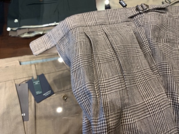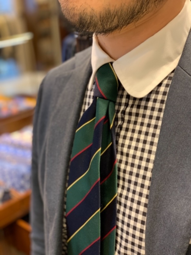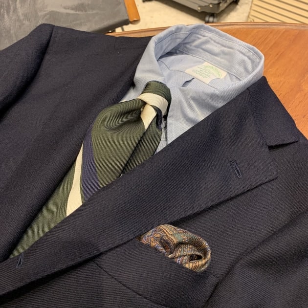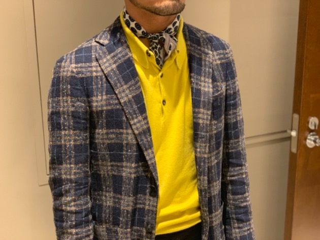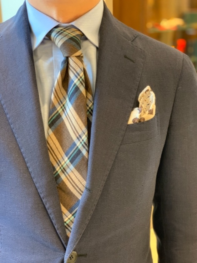 パンツのチェックの組み合わせが、ほんのりとグリーンとブラウンでしたので、ネクタイとチーフとさり気なく拾ってます。