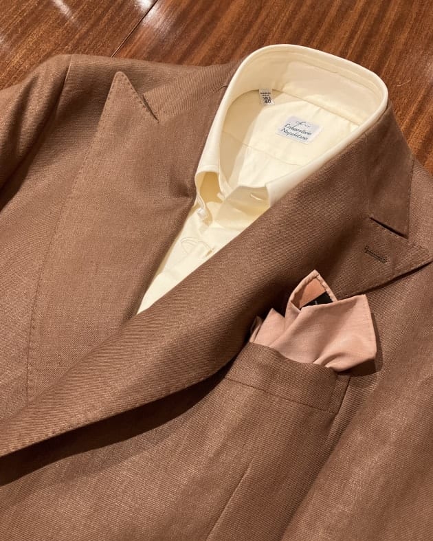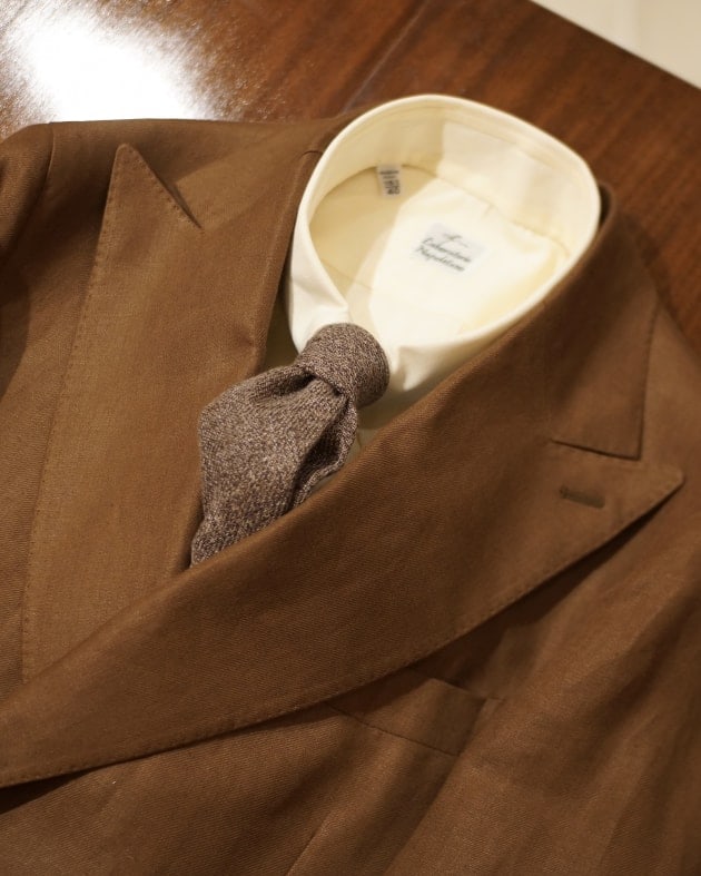 チーフの代わりにセッテピエゲのネクタイを胸ポケットに挿す。なんてのも粋ではないでしょうか?