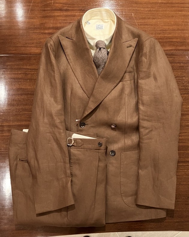 リネンのネクタイを絞めていますが、タブカラーをノータイで着て、ポケットにサングラスを挿したり。