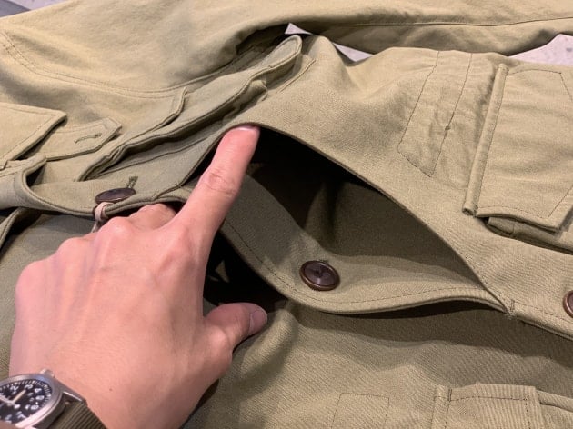 ハンティングジャケットから。捕らえた獲物を入れる為にある左胸の大きなポケットが付いております(通称ゲームポケット)。ハンティングをしない私達にも収納が多いのは、手ぶらでお出かけ出来ますしありがたいですよね!
