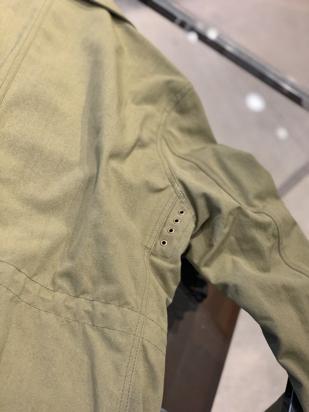コットンに近い生地感ですね。男らしさが際立ちます。脇の下には通気穴もあるのでナイロン特有の蒸れも軽減してくれます!ナイロン素材ですので春先から秋口まで長く使えるところがオススメポイントです。