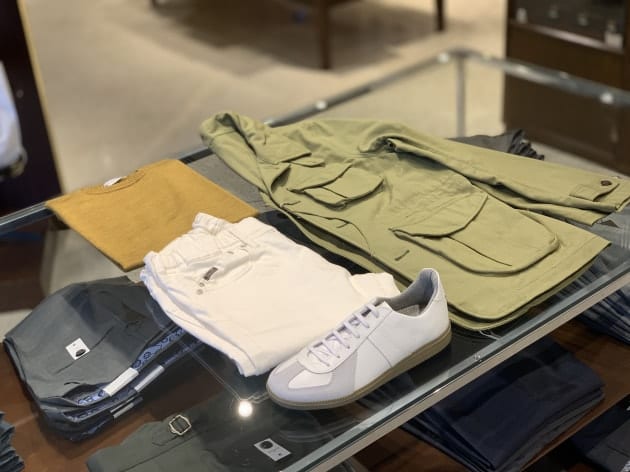 スタッフ久我です。この日は金ボタンのブレザーを着用しておりました。そこをハンティングジャケットに変えて貰いました。今季、人気を博しているイエローのOXシャツとも淡いオリーブ色が良いつながりですね。敢えてタイドアップもオススメです!