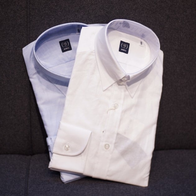 都会的な街並みに馴染む様に、Vゾーンはホワイトシャツとブラックニットタイ、とシンプルに構成しました。