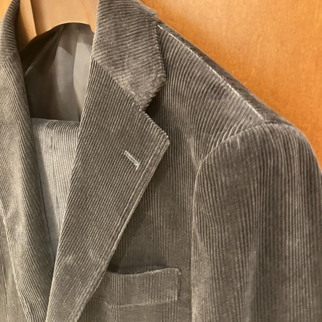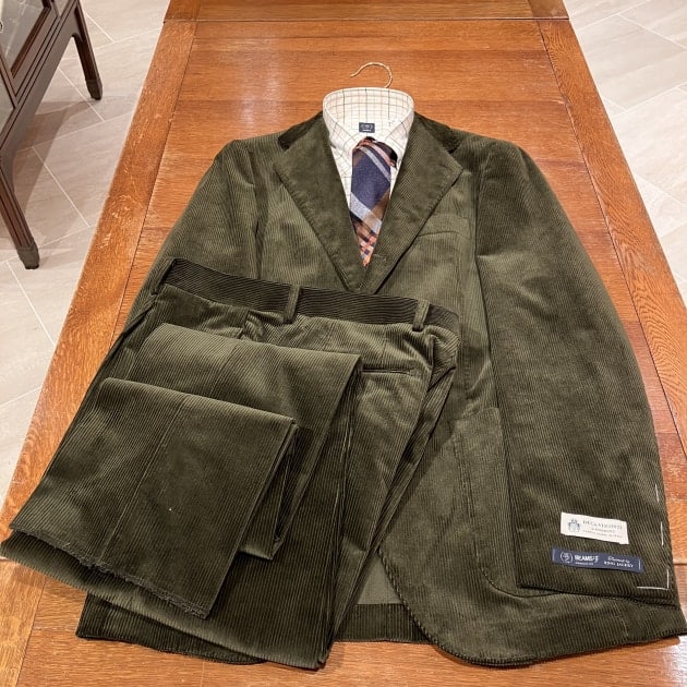 <Ermenegildo Zegna>の生地を使った温かみを感じるベージュのコーデュロイスーツです。