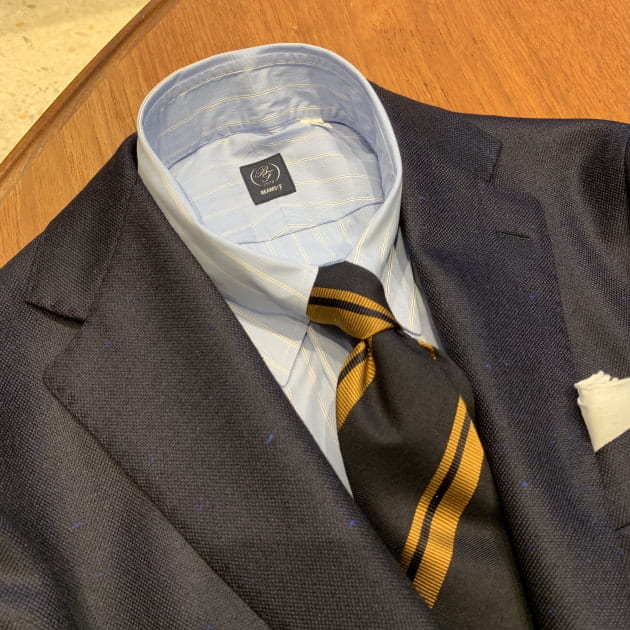 タイも艶を抑えた素材感で、スーツとの繋がりを意識して、イエローを差し色に。