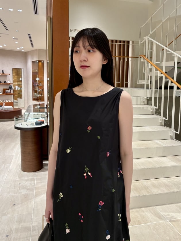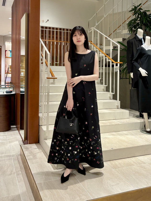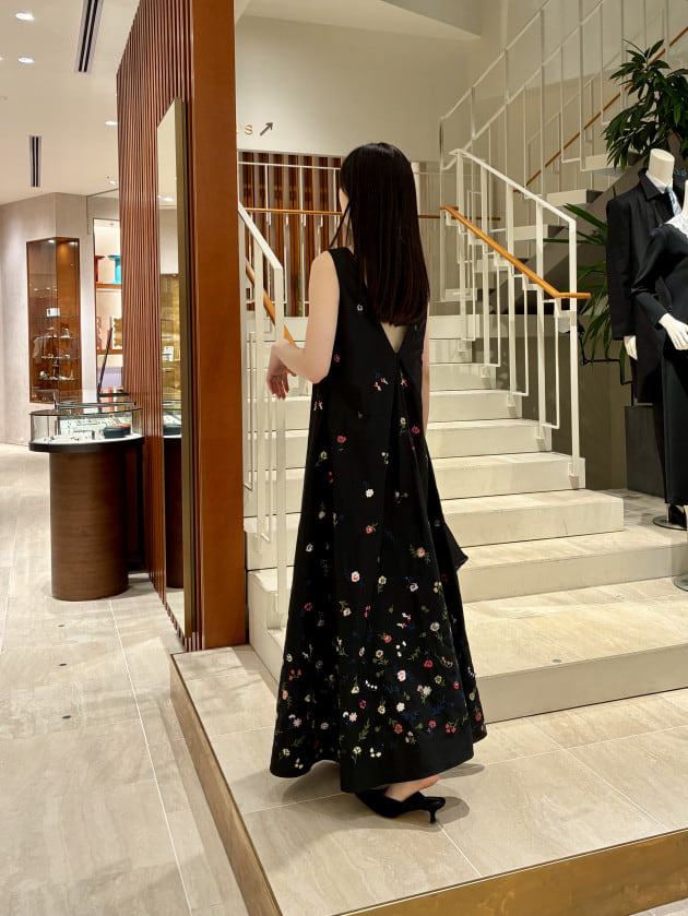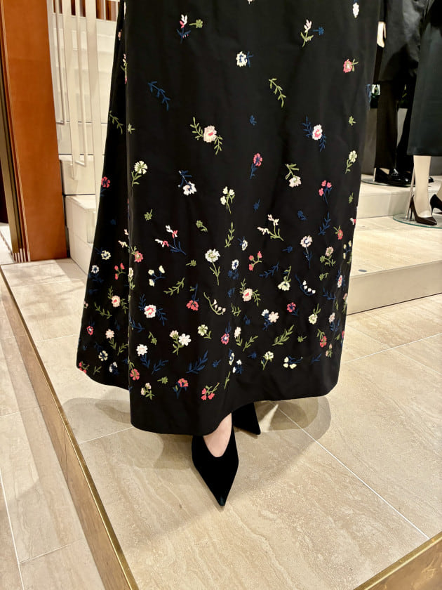 カラフルで華やかな刺繍が可愛い〈COGO〉のドレス。裾にかけて、小花が散りばめられているデザインとなっています。