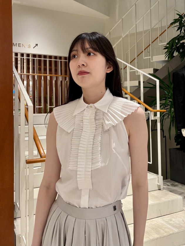 • ブラウス〈AQUILANO RIMONDI〉商品番号 64-01-0711-450:クラシカルなピンタックと、大胆なフリルのディテールが目を惹くノースリーブブラウス。マニッシュさとフェミニンさが絶妙なバランスで共存し、洗練されたモダンなエレガンスを演出します。