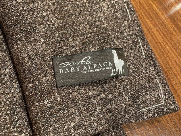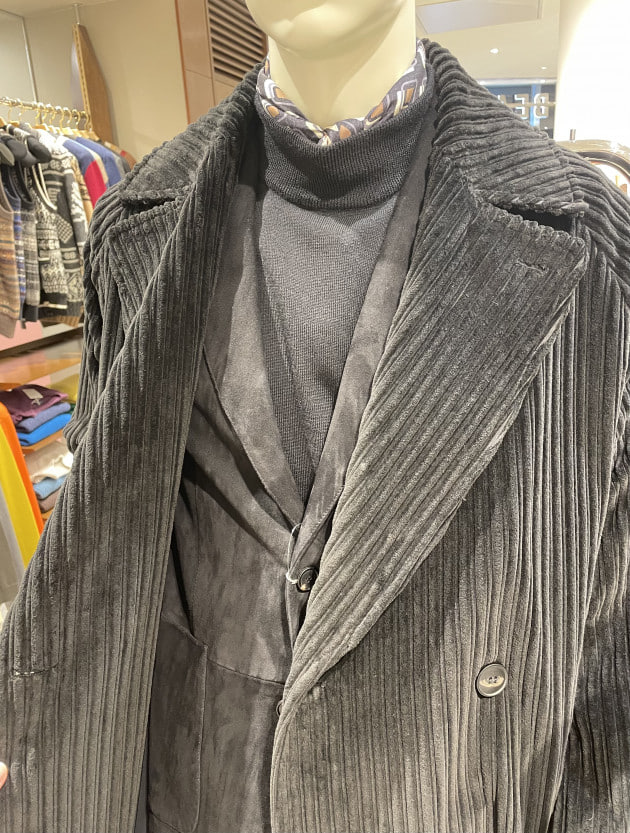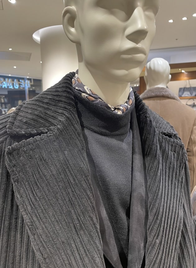 サキソニーと謳ってますが、毛足が非常に短く秋口から活用頂きやすいイメージです。起毛した素材ですが、ブラックで光沢のある生地なので都会的ですね。