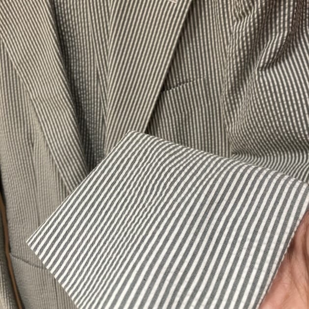 ベージュのシアサッカージャケットに差し色はテラコッタのニットに肩掛けしました。