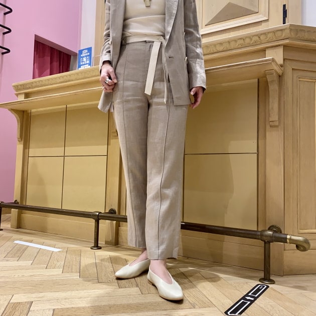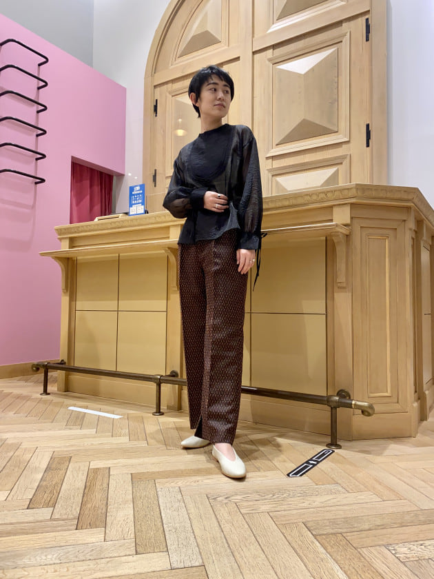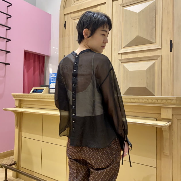 先程ご紹介させて頂きました、オーガンジーブラウスの色違いでパンツと合わせてみました。