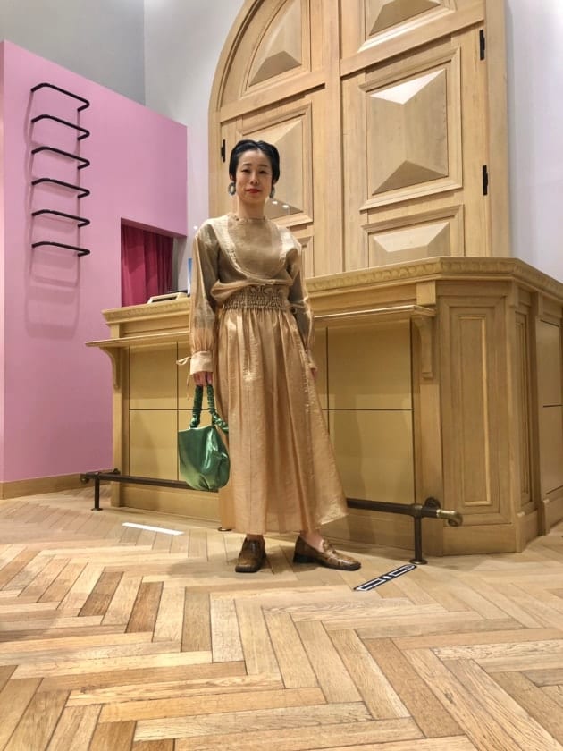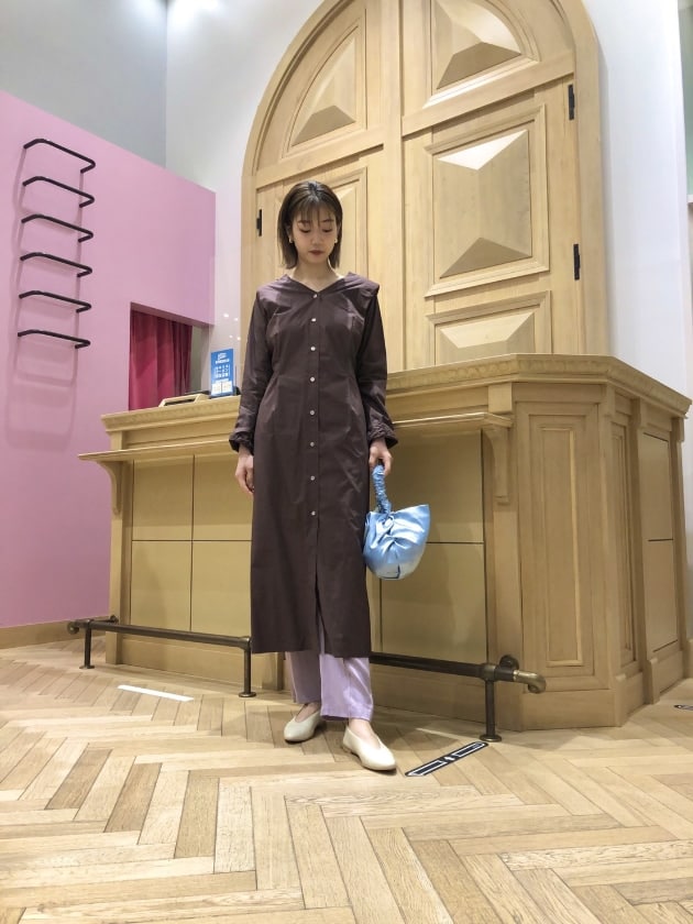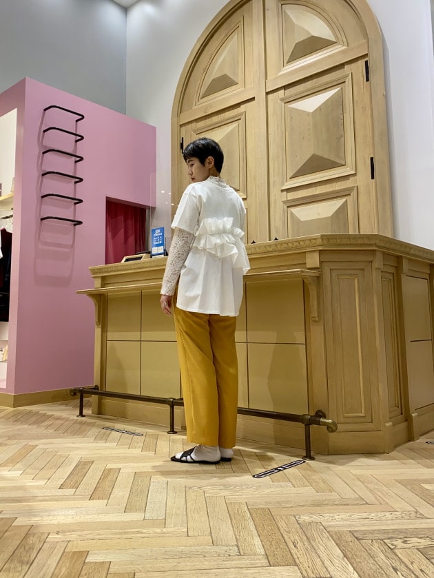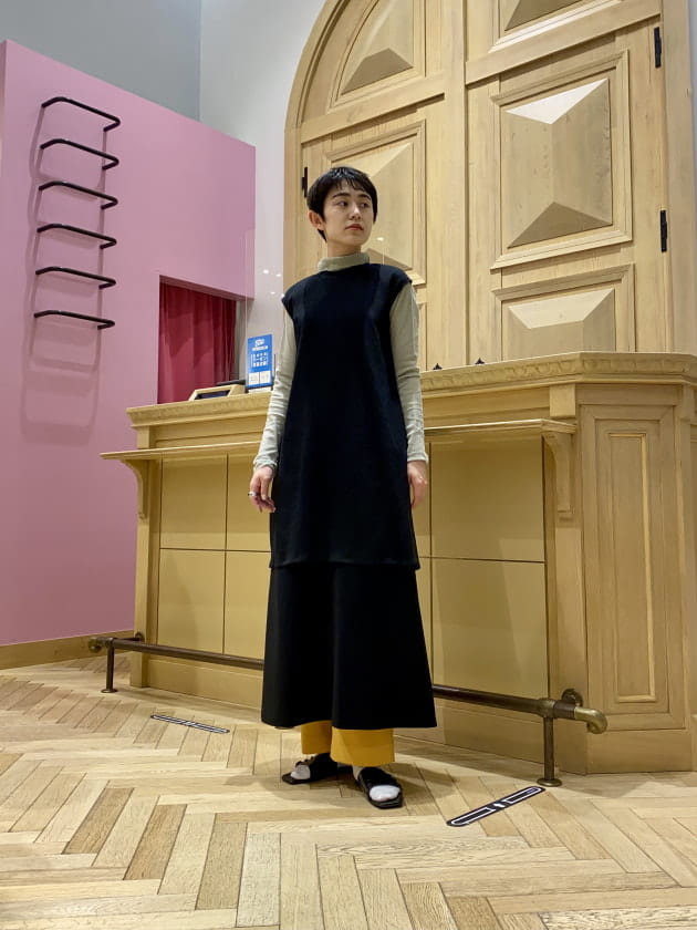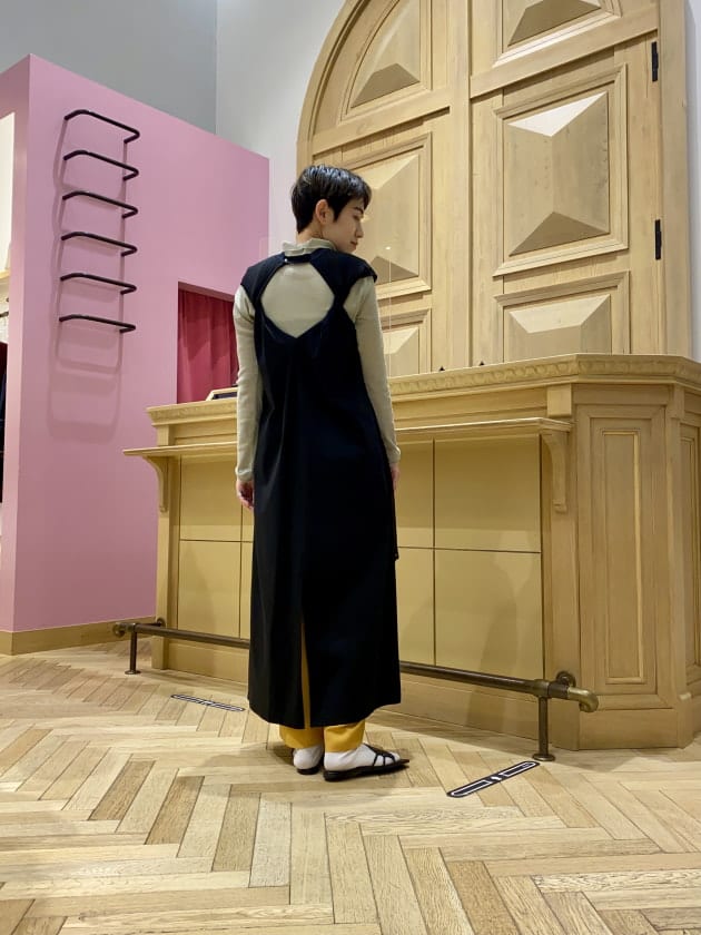 先程のイエローのパンツと合わせて着てみました!ワンピースですが、一緒にに合わせるだけで雰囲気もがらりと変わりますよね。