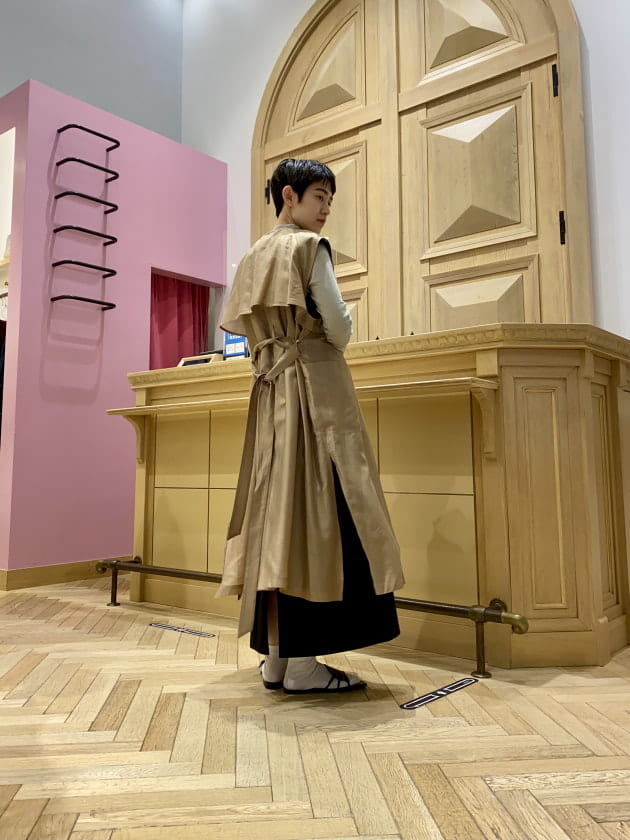 先程のコーデに上からジレを羽織ってみました!だいぶ雰囲気が変わりますよね。