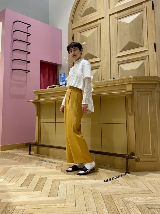 〈RBS〉のイエローのワイドパンツを合わせて春夏らしい色合わせです。