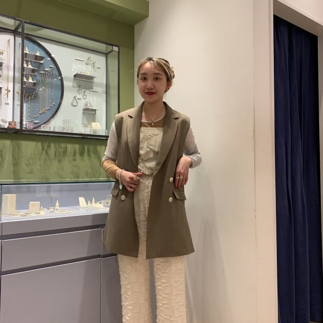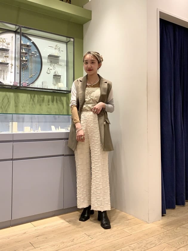 最初のコーディネートで紹介したノースリーブジャケットとのあわせも100点です。