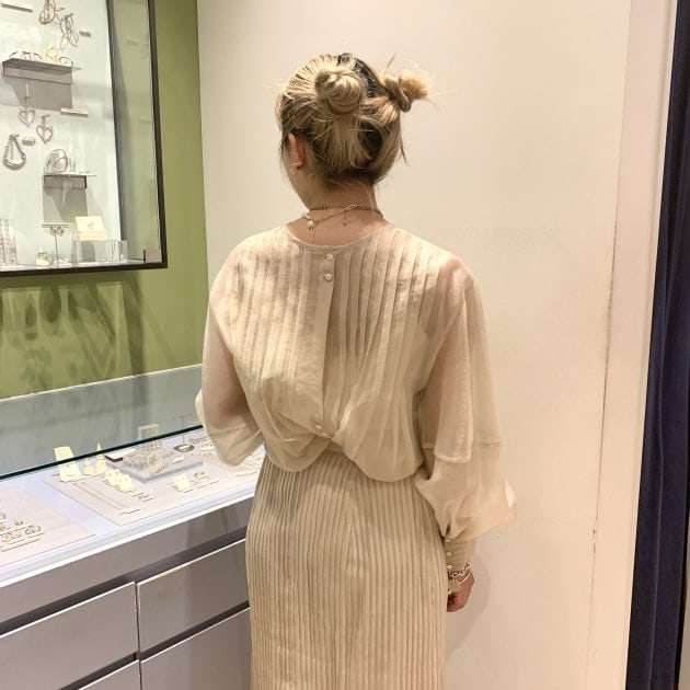 昨年もでていたオーガンジー素材のセットアップ。今回はオーガンジー素材の中でもとっても柔らかく、ヘルシーな肌見せになるよう胸元の透け感を抑えています!