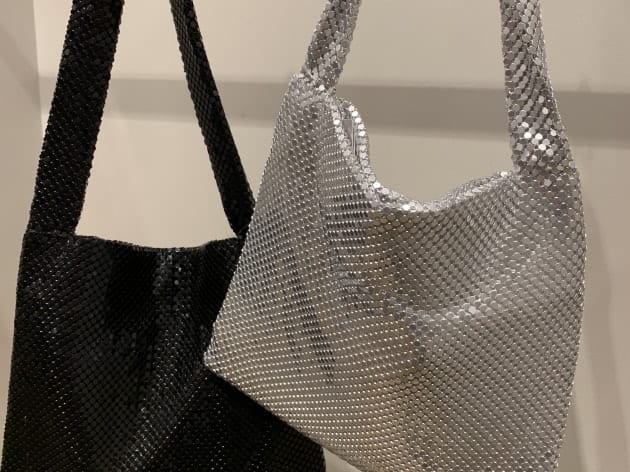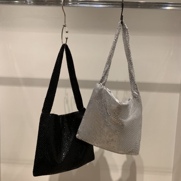 シンプルながらに存在感のあるメタルバッグ。チャームつけたりしてカジュアルに持つのもかわいい◎