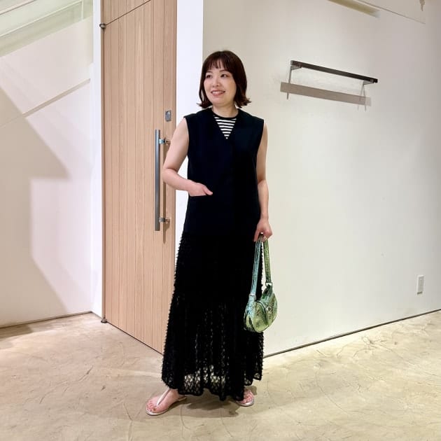 落ち着いたグリーンとボーダーが目を惹く組み合わせですね◎