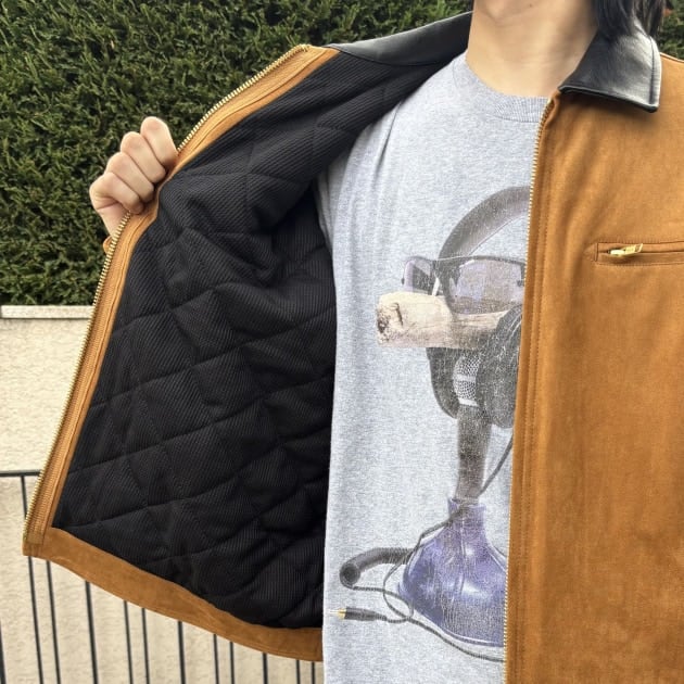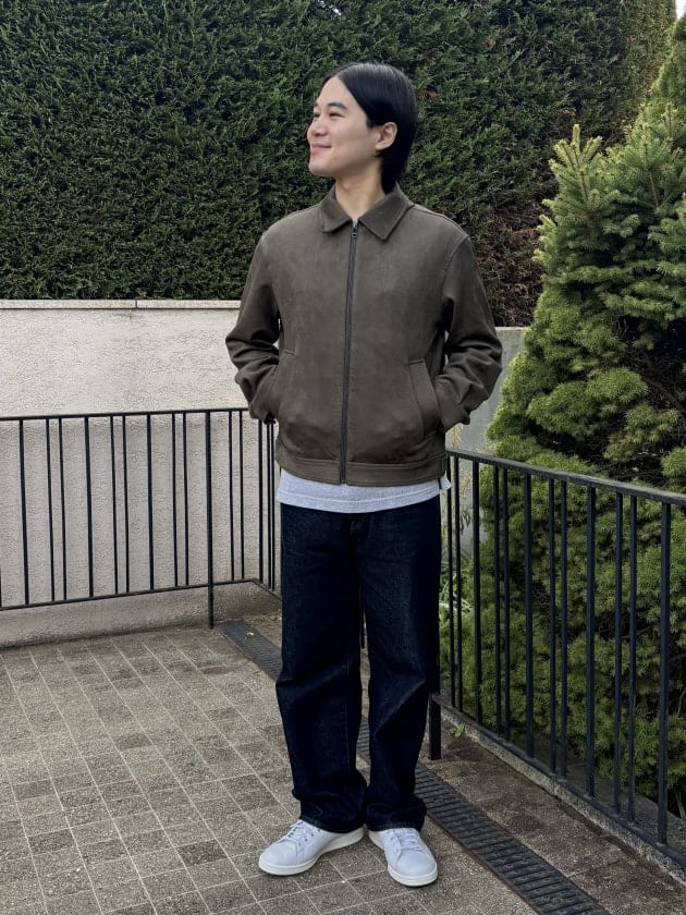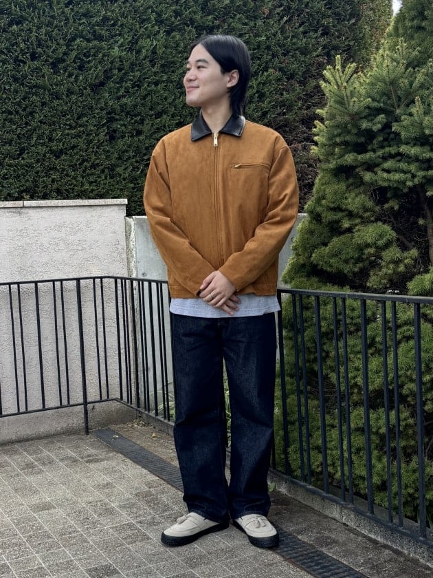 やや短めな丈感なのでインナーのTシャツを出せば全体の暗いトーンを中和し抜け感をプラス