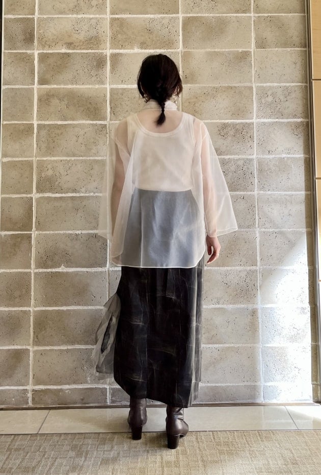 シンプルな形ですが、チュール素材とミックスされていることで、大人フェミニンに!