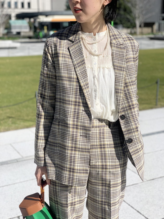 こちらは細かいガンクラブチェックのジャケットです。重くなりすぎず春にも羽織りやすいカラーリングでおすすめです!