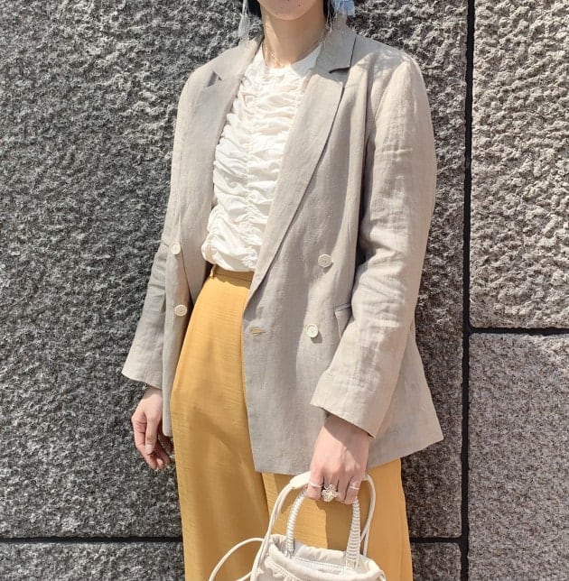 切り替えがポイントで、カチッとなりすぎません!裏地もついているので、日中羽織るには少し暑いかもしれません。秋にも着ていただけるので今から手に入れても問題ないと思います。