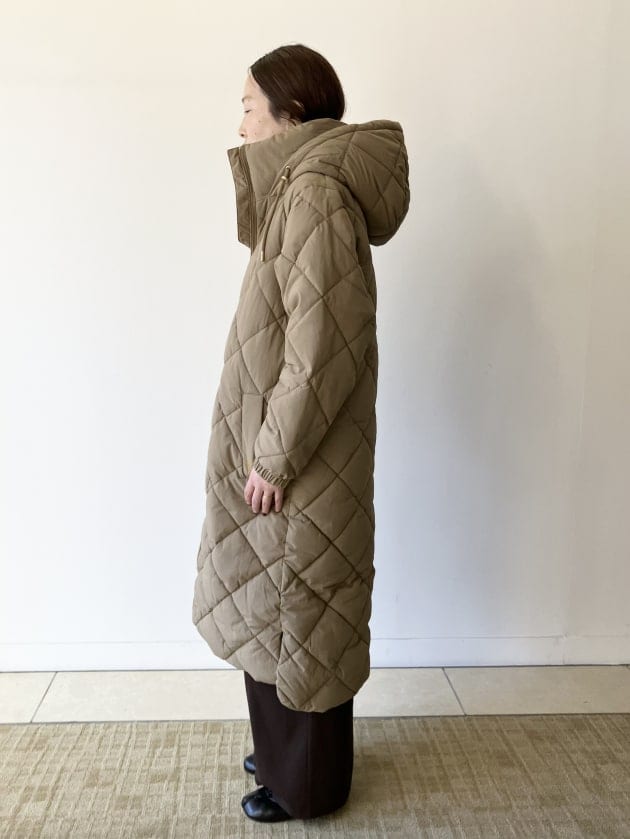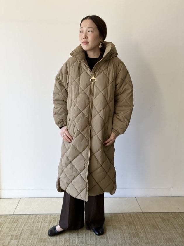大ぶりのダイヤモンドステッチが目を引くロングコートになります。