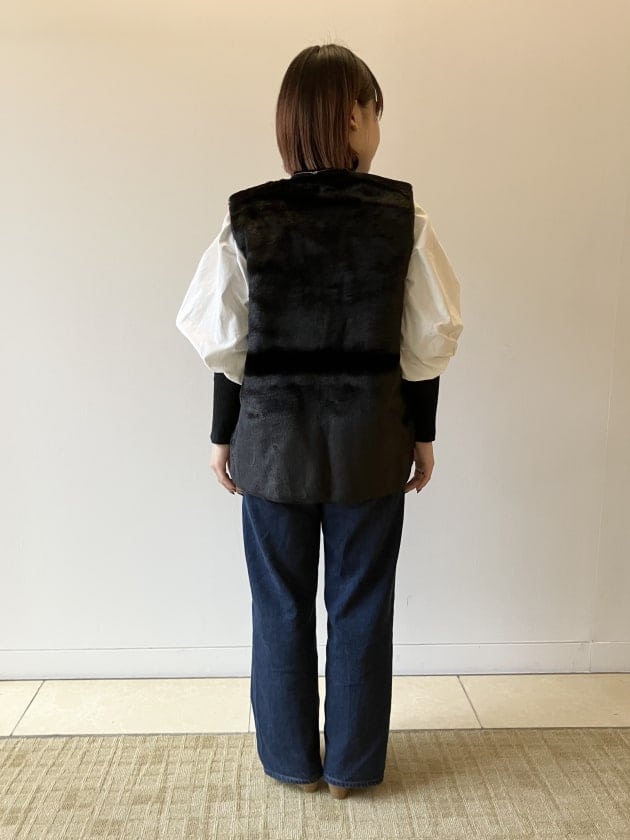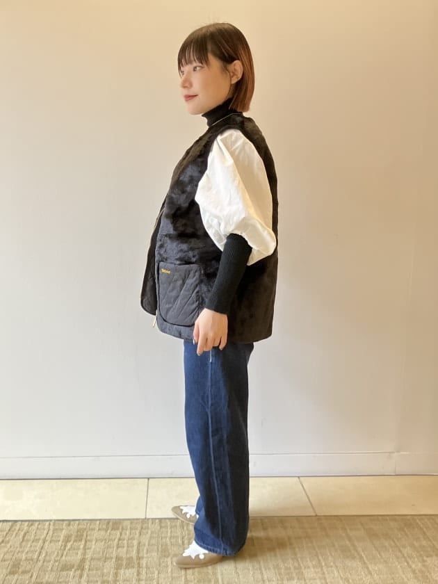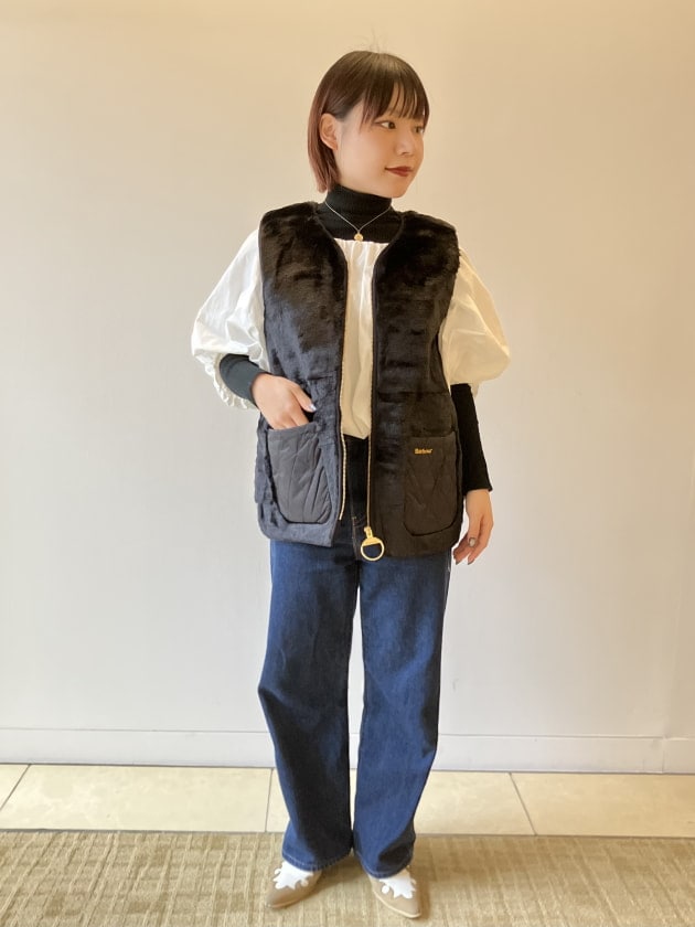 〈BARBOUR(バブアー)〉のワックスジャケット用ライナーベストをベースに、エコファーでモダンに仕上げたジレになります。