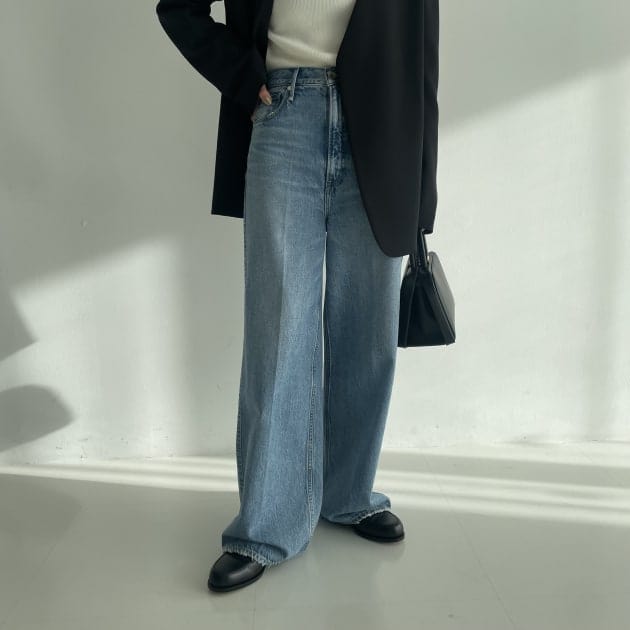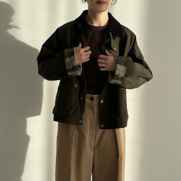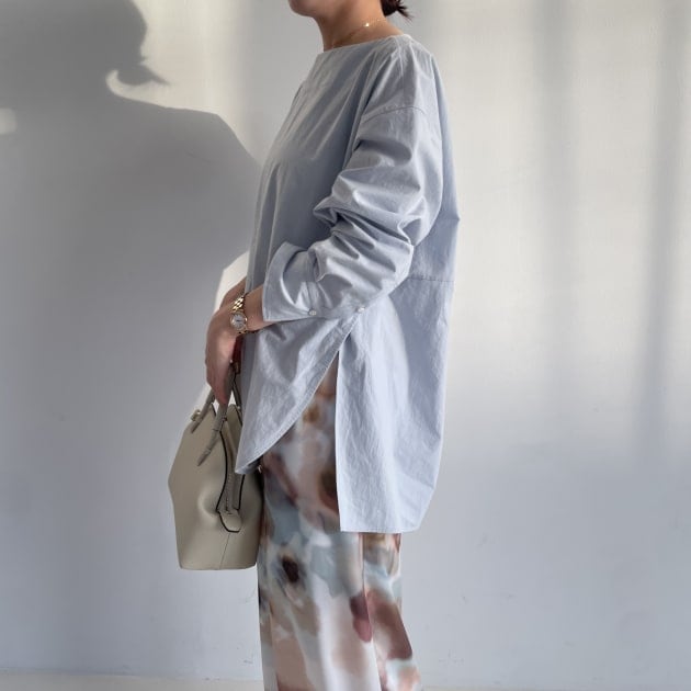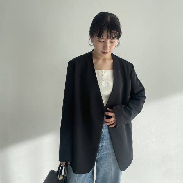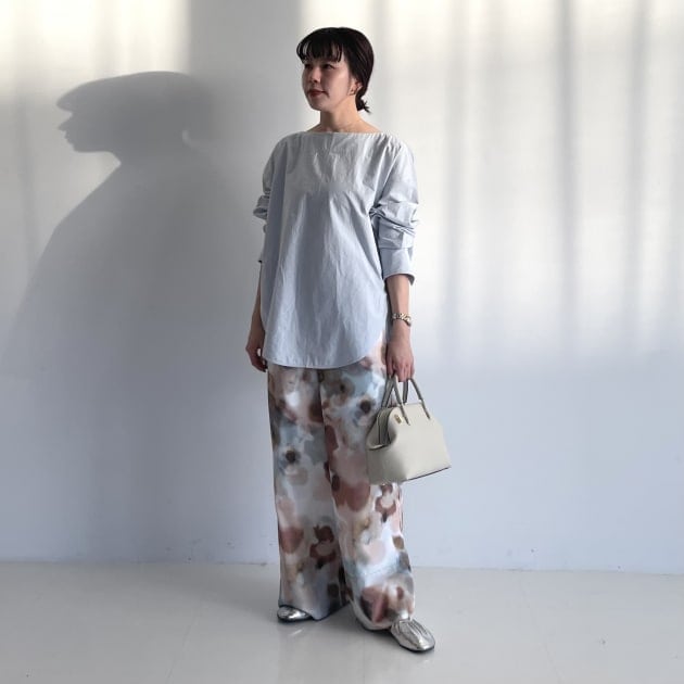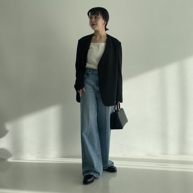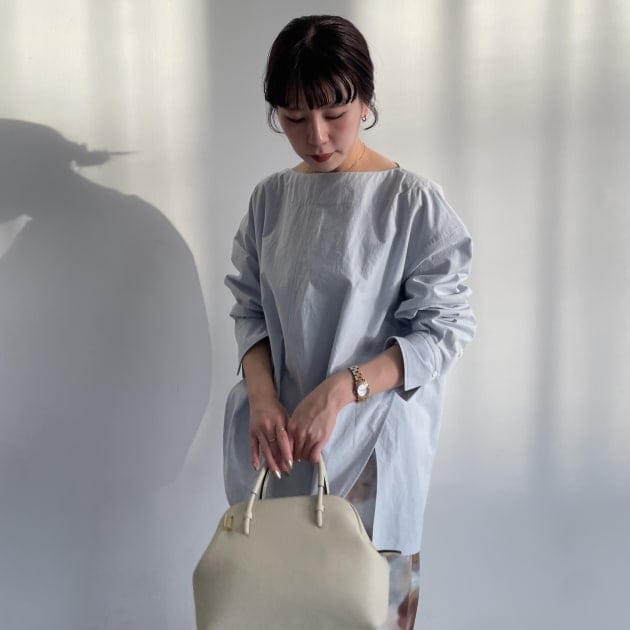 鎖骨が見えるネックデザインなので、私はAURALEEトップスをレイヤードしました。