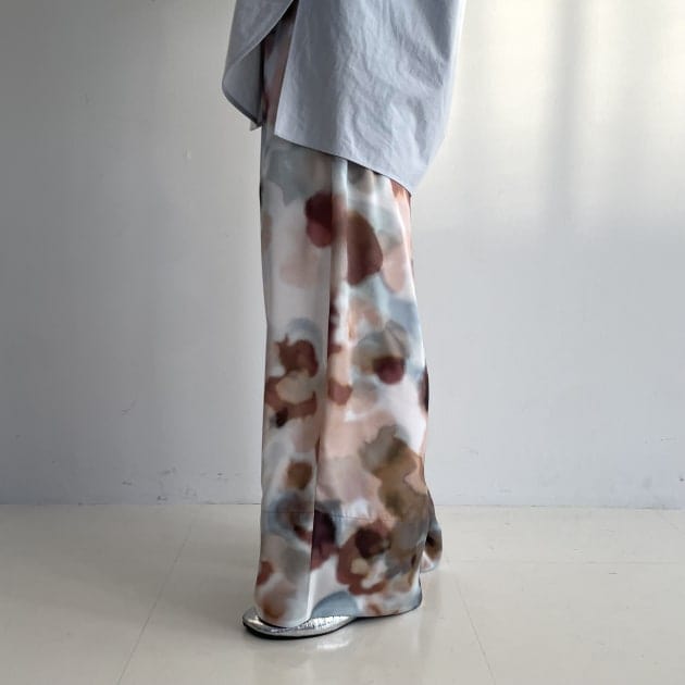 春らしく艶感あるサテン素材のスカートと合わせて明るいトーンのスタイリングにしました。ニットは着丈が長めなので、ロングスカートとの相性も抜群です。