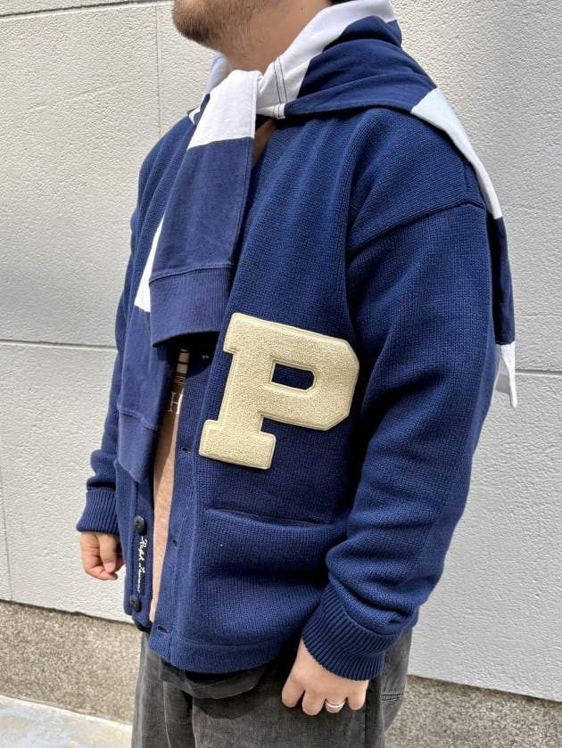 クラシックなバーシティスタイルを彷彿とさせるローゲージのカーディガンをベースとなっており、フロントに配置されたシグネチャーであるPのシェニールパッチが特徴的なアイテムです。
