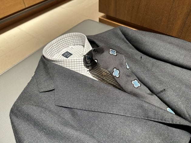 比較的大柄のパターンなので、ベースカラーの面積が多いネクタイとのコーディネートがお勧めです。