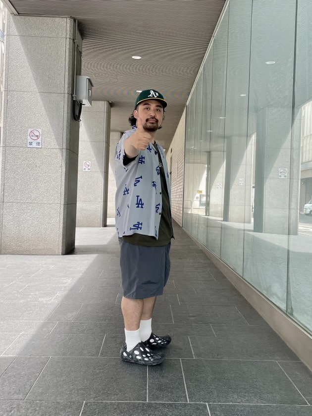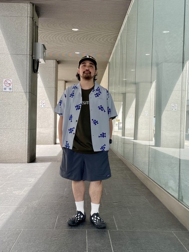 ちなみに着用したのはブラックのカラーリングで、1940~1950年代に作られたヴィンテージアロハシャツ「TROPICAL FRUITS」「PEACOCK」「AGE OF DISCOVERY」「BUG EYED FISH」の4つのデザインをブラック系の配色で組み合わせたものとなっております。