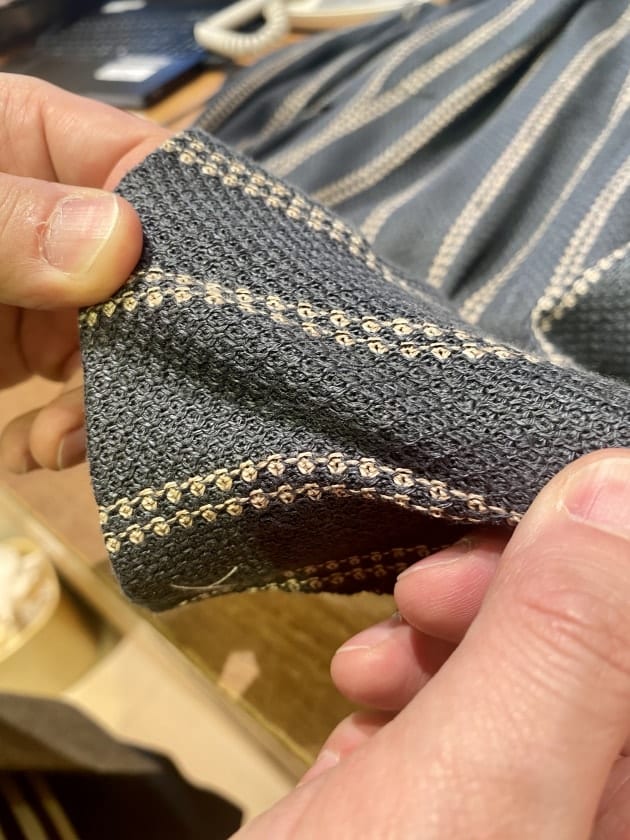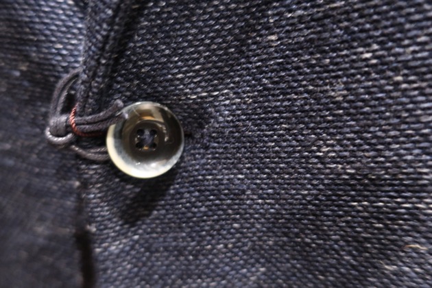 表生地の素材はリネン100%、伸ばしてみるとこのブランドらしいストレッチを感じさせる1着です。