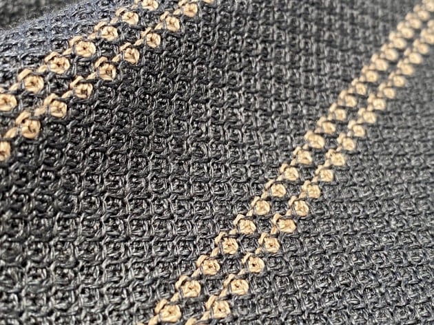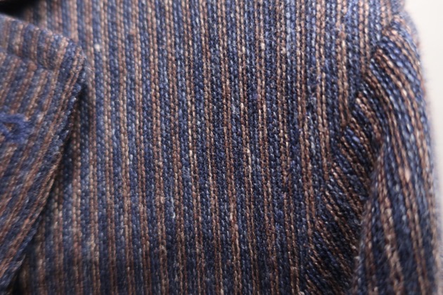 素材は、コットン98%・ポリウレタン2%の伸縮性の高い生地です。改めて生地を接写してみても目を疑ってしまう一着です。先染めウール調のプリントが秀逸です。