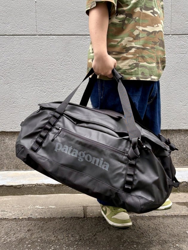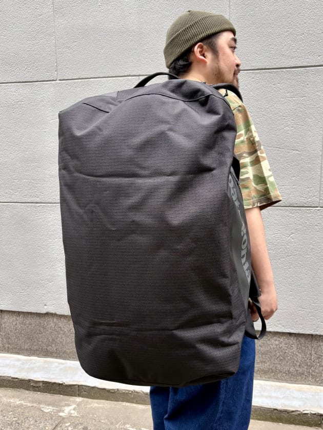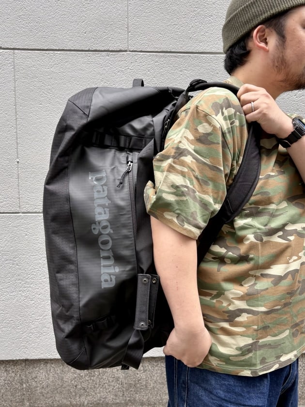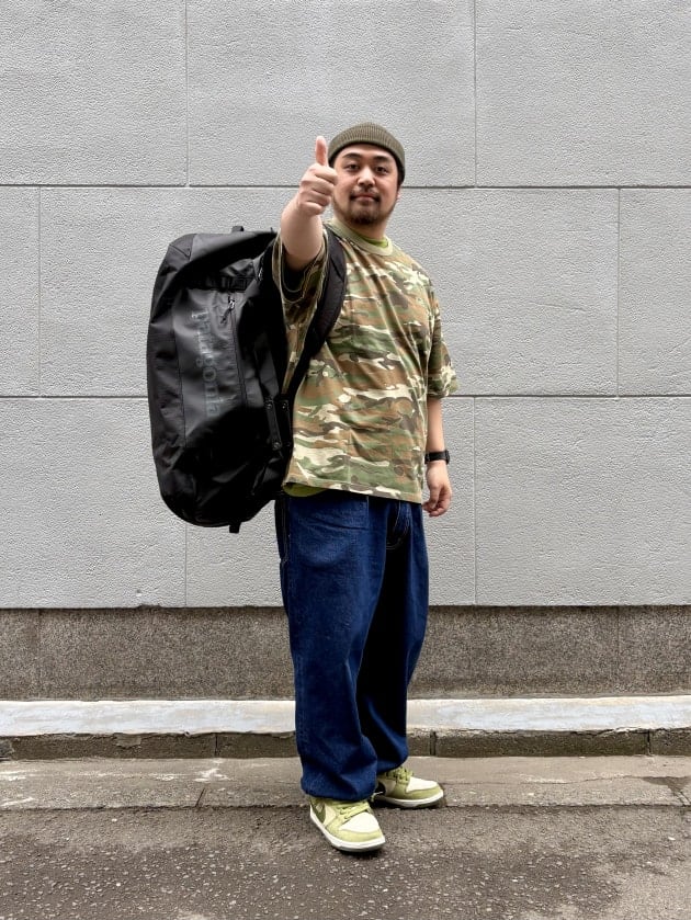 Tシャツがカモデザインだったので、サバイバル感のあるコーディネートを意識してバッグにはPatagoniaのBlack Hole Duffel 70Lを使用しております。