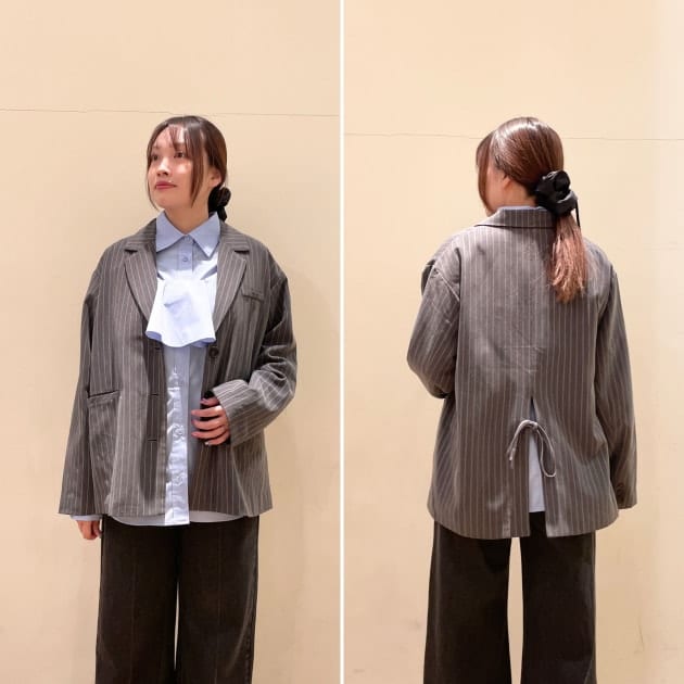 そこにリボンデザインが加わることで、シンプルなジャケットとは少し違った柔らかい印象になります。きれいめな雰囲気の中に可愛らしさがプラスされるため、普段ジャケットをあまり着ない方でも取り入れやすいデザインです◎