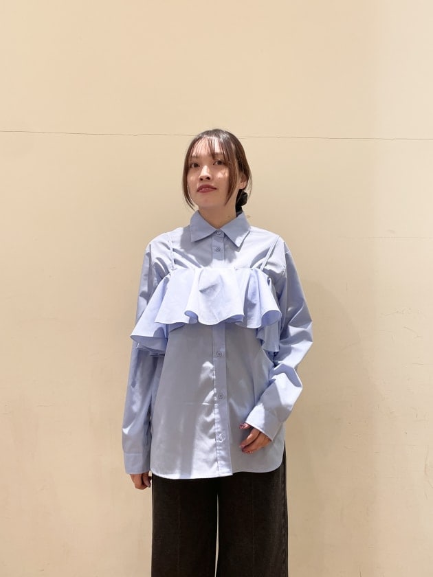 シャツとビスチェがセットになっているため、一枚でコーディネートに立体感が生まれるのが特徴です。フリルデザインが程よく華やかな印象を与えてくれるので、シンプルなジャケットとの相性も抜群です!