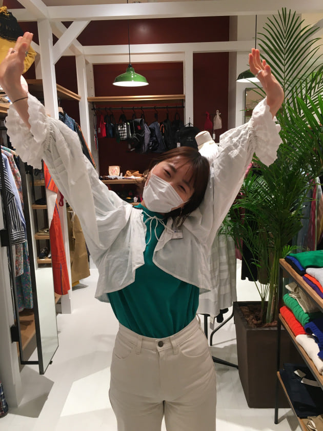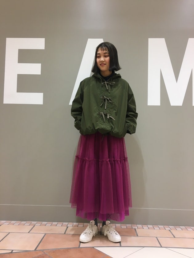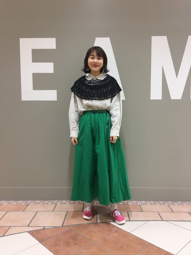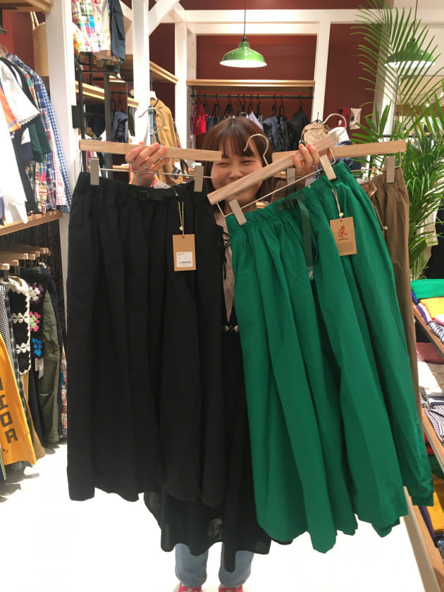 とにかく軽い、軽い、軽いスカートです。ギャザーの入り方も自然な表情で可愛いですね。夏になったら上にTシャツ、下サンダルでラフにきてもかわいいです。原田のおすすめはまばゆいほどのグリーンです〜!!