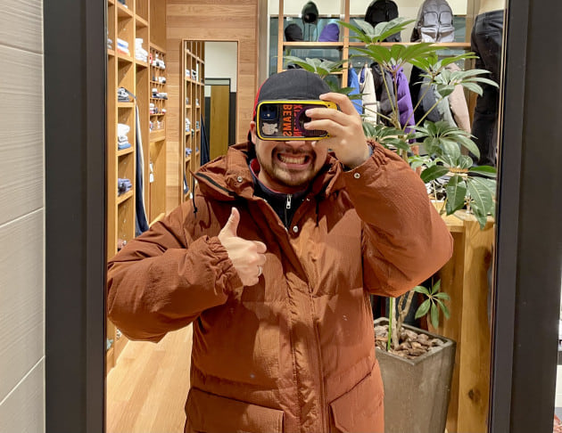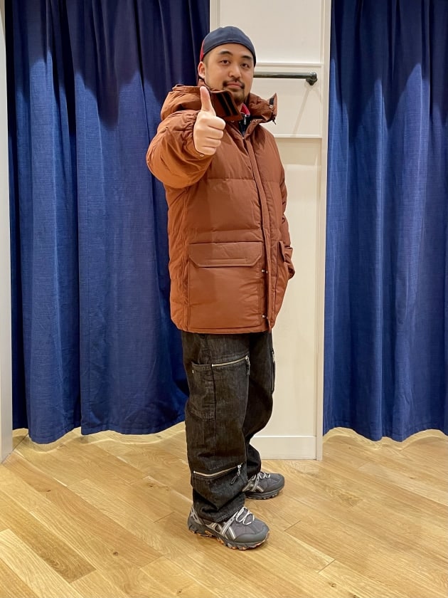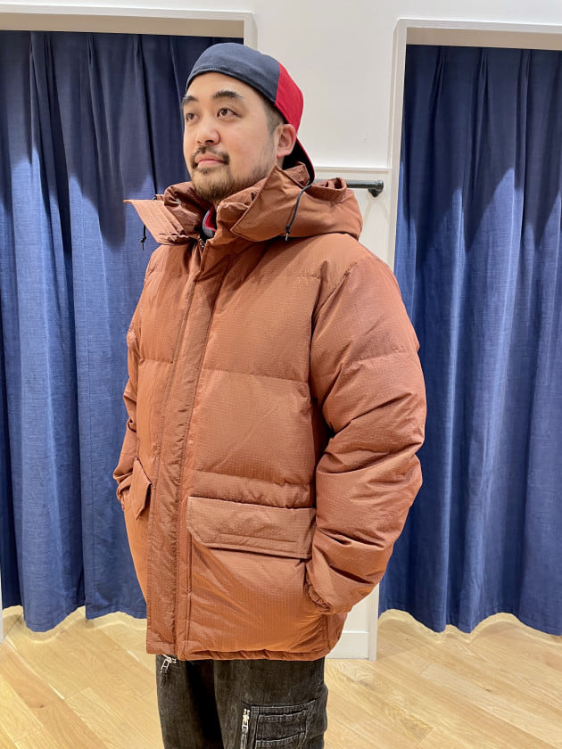 BEAMSのリップストップマウンテンダウンジャケットを着用したスタイリングです。