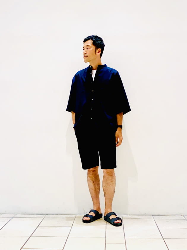 シューズがシャワーサンダルでもトップスに襟ものを合わせるだけで、くだけ過ぎないスタイリングに昇華します!
