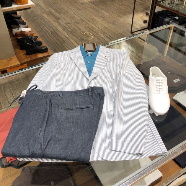カジュアル過ぎるよりは上品にネイビーのテーラードジャケットの代わりくらいの感覚で合わせたい1着ですね。