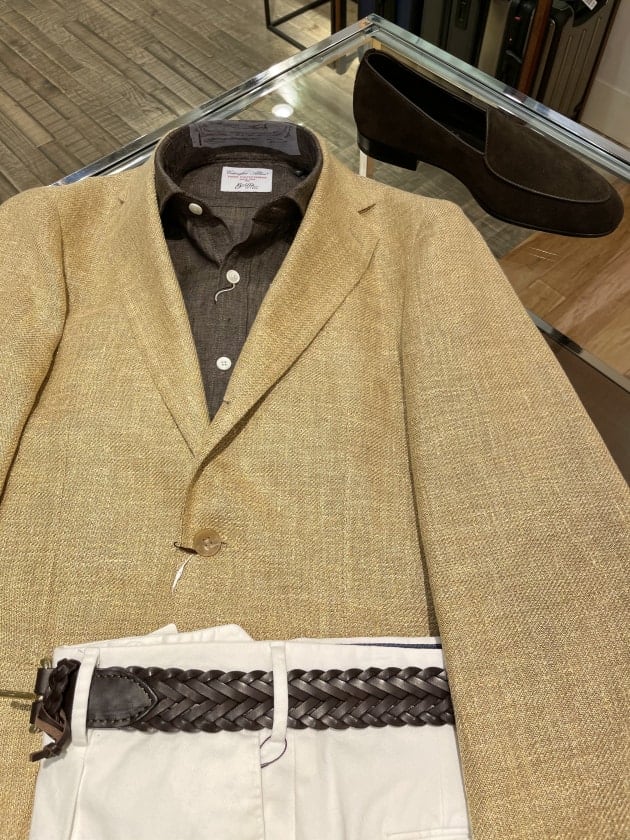パンツはワンプリーツのベルトループ付き。ワンプリーツが入っていることでドレッシーな印象ですが、生地がリネンなのでシワの入った時の表情が良さそうです。