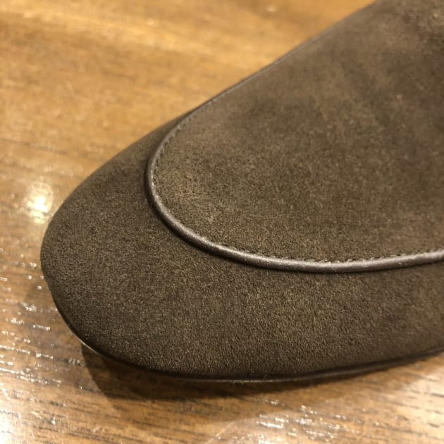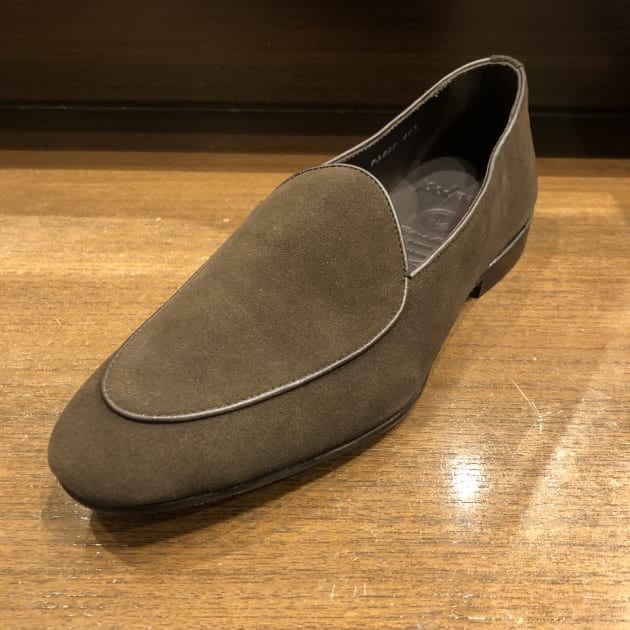 足元はグレーのスラックスに、スエードのデザートブーツを。カッチリとしすぎないような…イメージです。