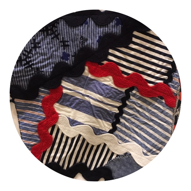 先程のレースのデザインに比べ、カラフルでパッチワークの形や色合いがとても個性的な1枚となっております。