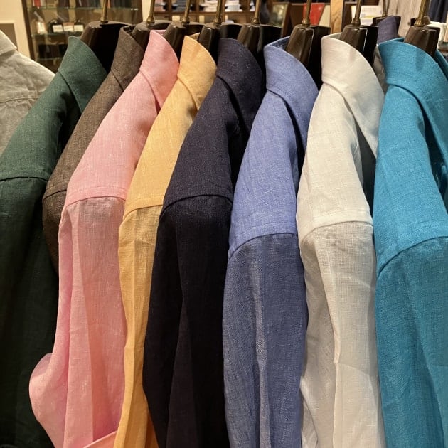 コットンリネン、もしくはリネン100%と夏場でも腕まくりをして着用出来ますね。