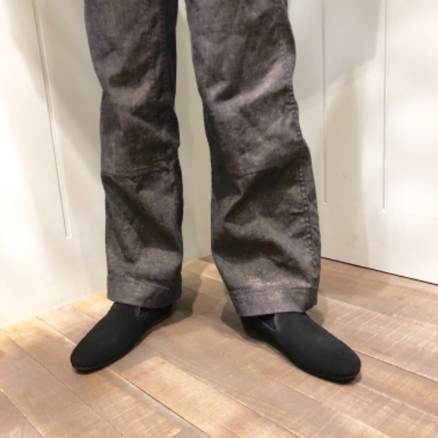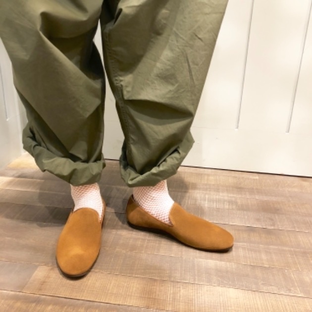 レザーのオペラシューズが定番ですが、スエードでカジュアル感を出す事でデニムとも合わせやすいです。