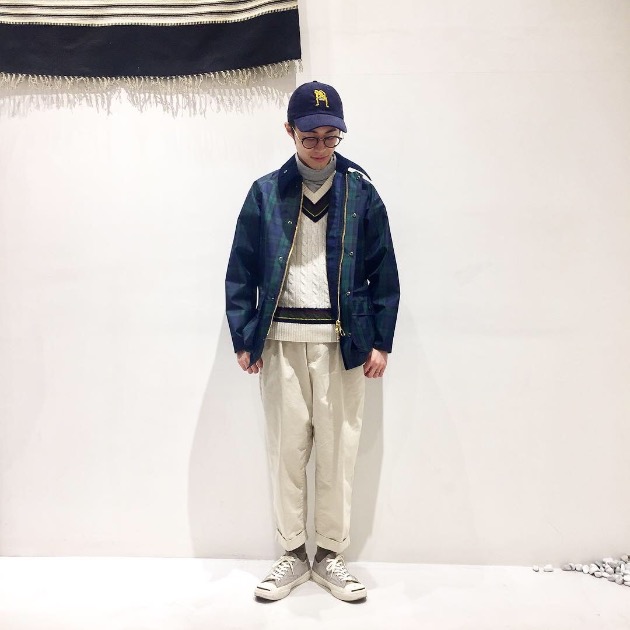 まだまだ肌寒い日の続くこの時期にはベストやニットと合わせるスタイルを提案致します。パンツはプリーツ入りのアイテムを選び、キャップと足元にはスニーカーでクリーンカジュアルにまとめました!