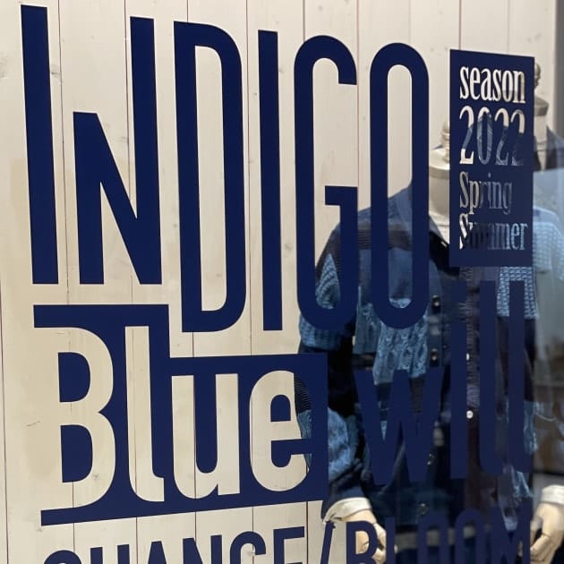 まずお店の入り口に面しているショップウィンドウには、2022年春夏シーズンのスタートのこのタイミングで今シーズン一押しの“インディゴファブリック”にフォーカスを当てつつ、《INDIGO×INDIGO》のスタイリングを。